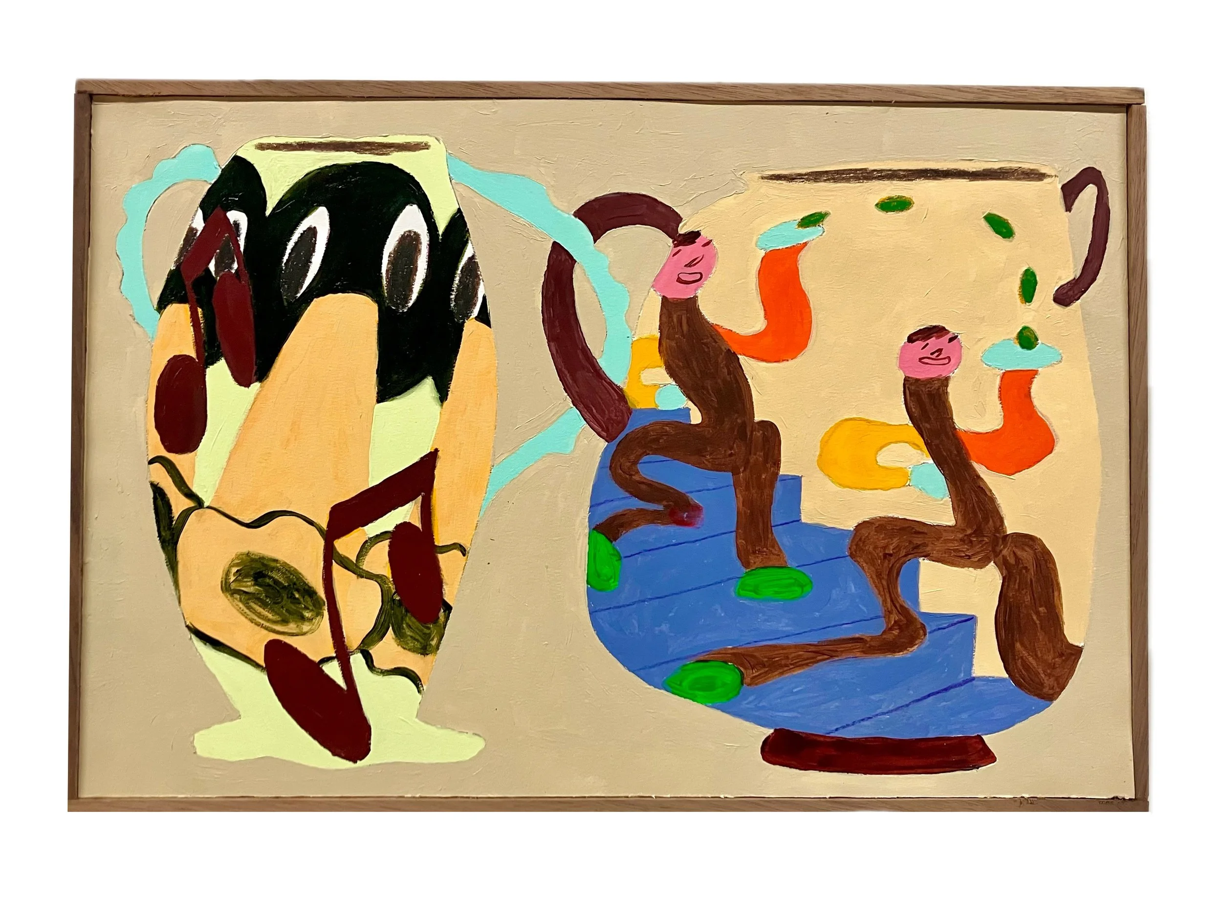 Abstract art painting featuring two human-like figures sitting on blue steps with orange, pink, and green heads, in front of oversized teacups with black, green, and brown patterns.
