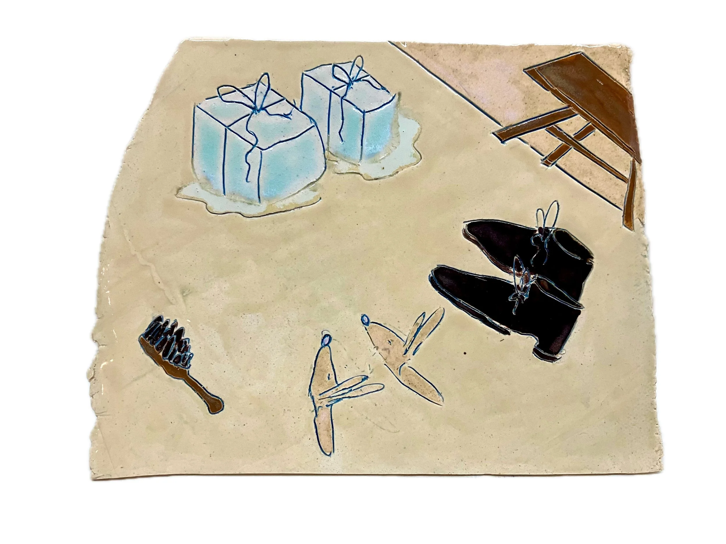 Illustration of two wrapped gifts, a pair of black shoes with butterflies, a brown hairbrush, a pair of ballet shoes, a wooden table, and a black handbag on a beige background.