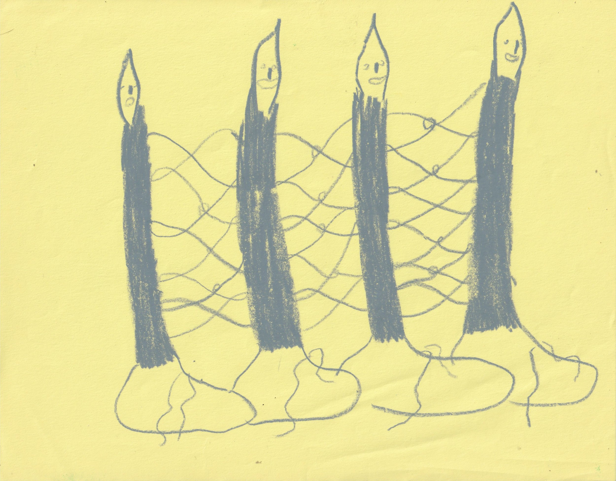 Drawing of four candles with happy faces, all with black bodies and yellow flames, on yellow paper with candle lines intertwining.
