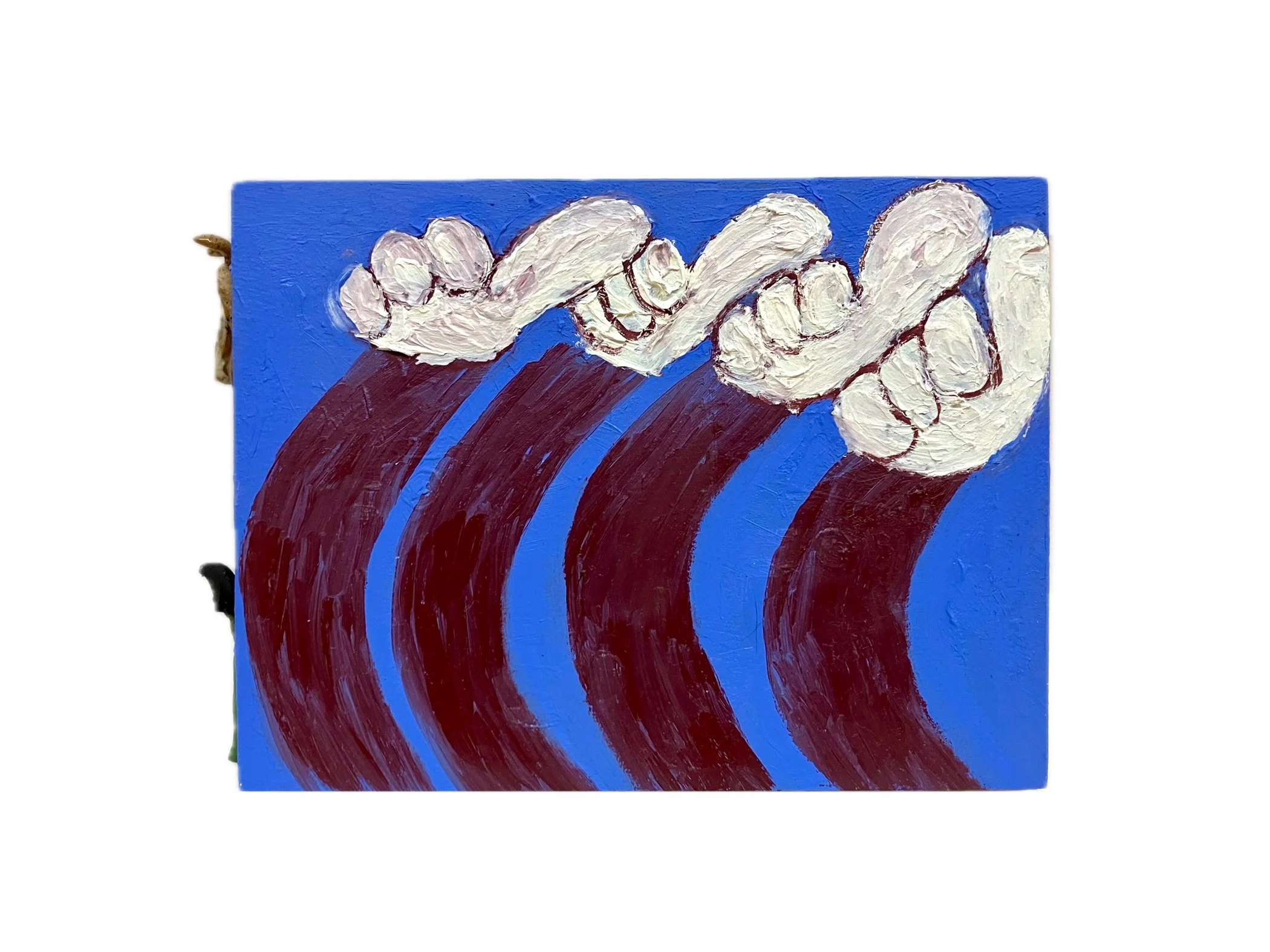 A painting of four fists with clenched fingers, raised in the air, with a blue background.
