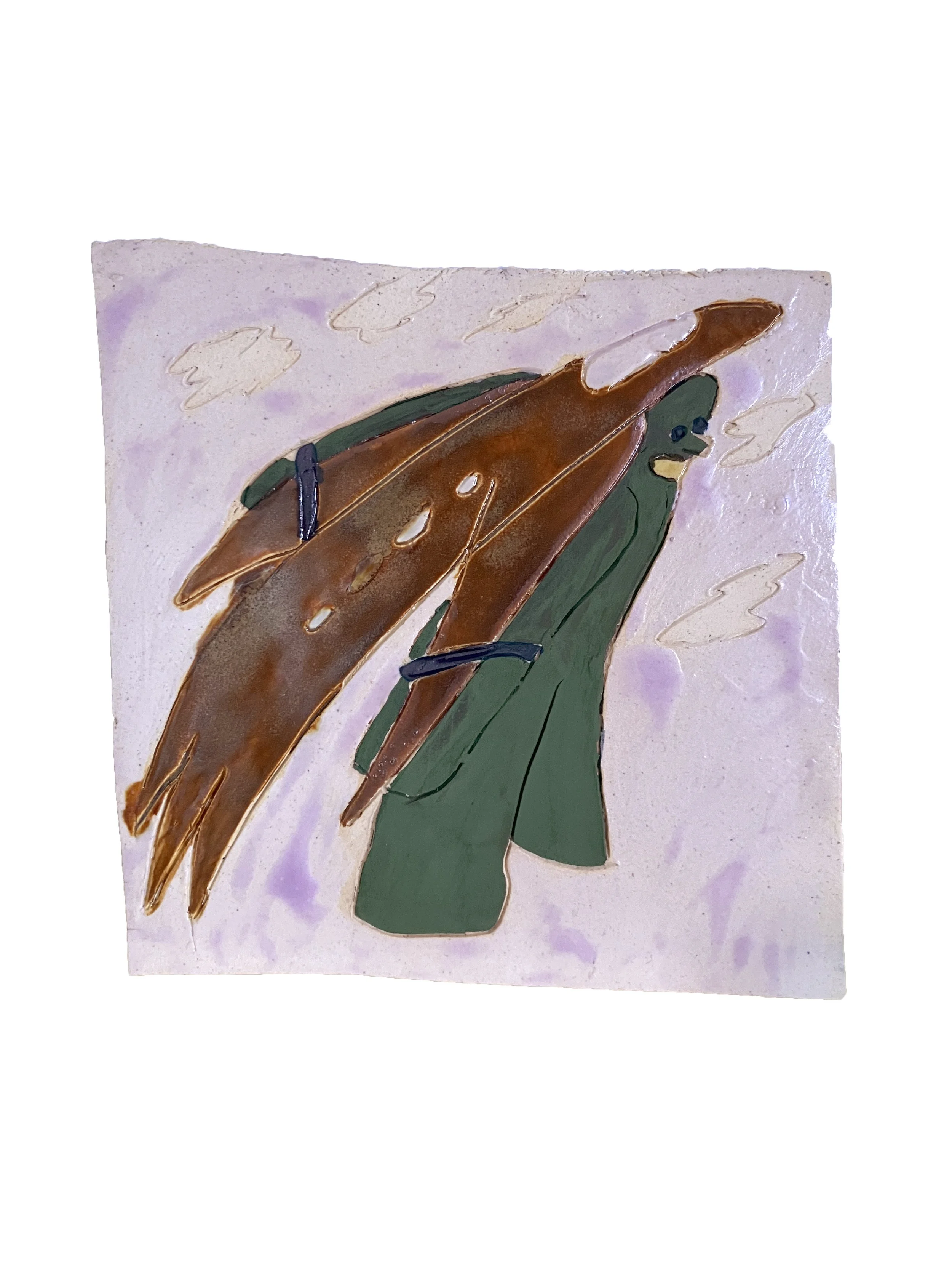 Colorful ceramic tile with green, yellow, and black abstract design featuring spiral pattern, leaf shapes, and a dark arc at the bottom.