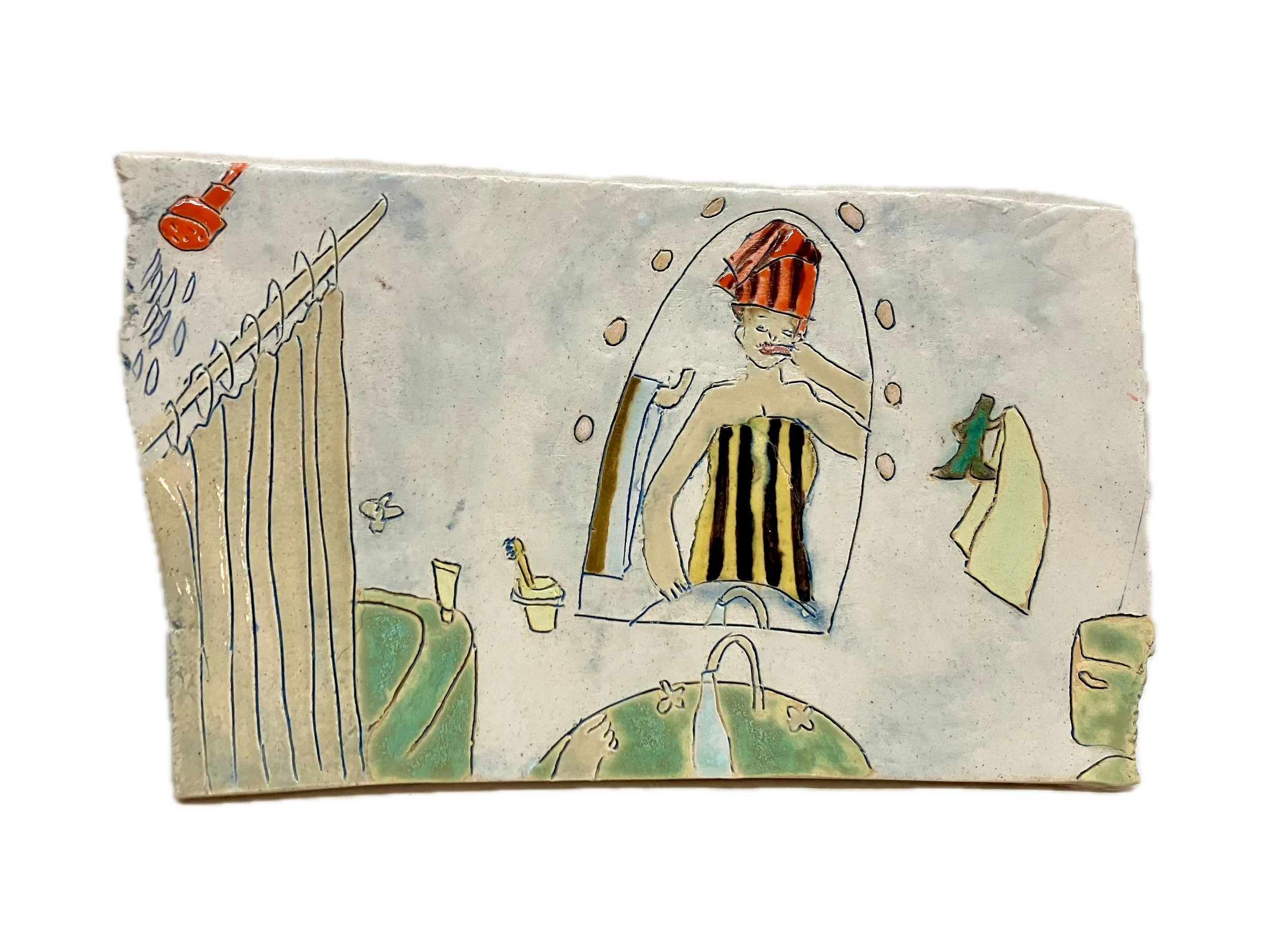Ceramic sculpture of a reclining figure, lying on a rectangular yellow wooden base, with black, orange, green, and beige details.